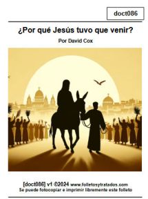 Doct086 ¿Por qué Jesús tuvo que venir? es un folleto sobre la razón por la venida de Jesucristo en la encarnación. La justicia de Dios exigió que el Salvador tuvo que participar en carne y sangre propia para cumplir con los requisitos de ser Redentor.